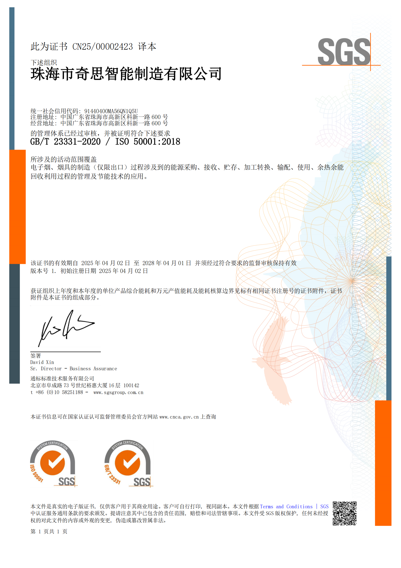 近日,珠海市奇思智能制造有限公司(下简称“奇思智造”)正式通过国际知名第三方机构SGS的外部审核,成功获得ISO 50001:2018能源管理体系认证!这一里程碑标志着我司在绿色制造、节能降耗领域全面迈入国际标准化新阶段,为可持续发展再添强劲动能。