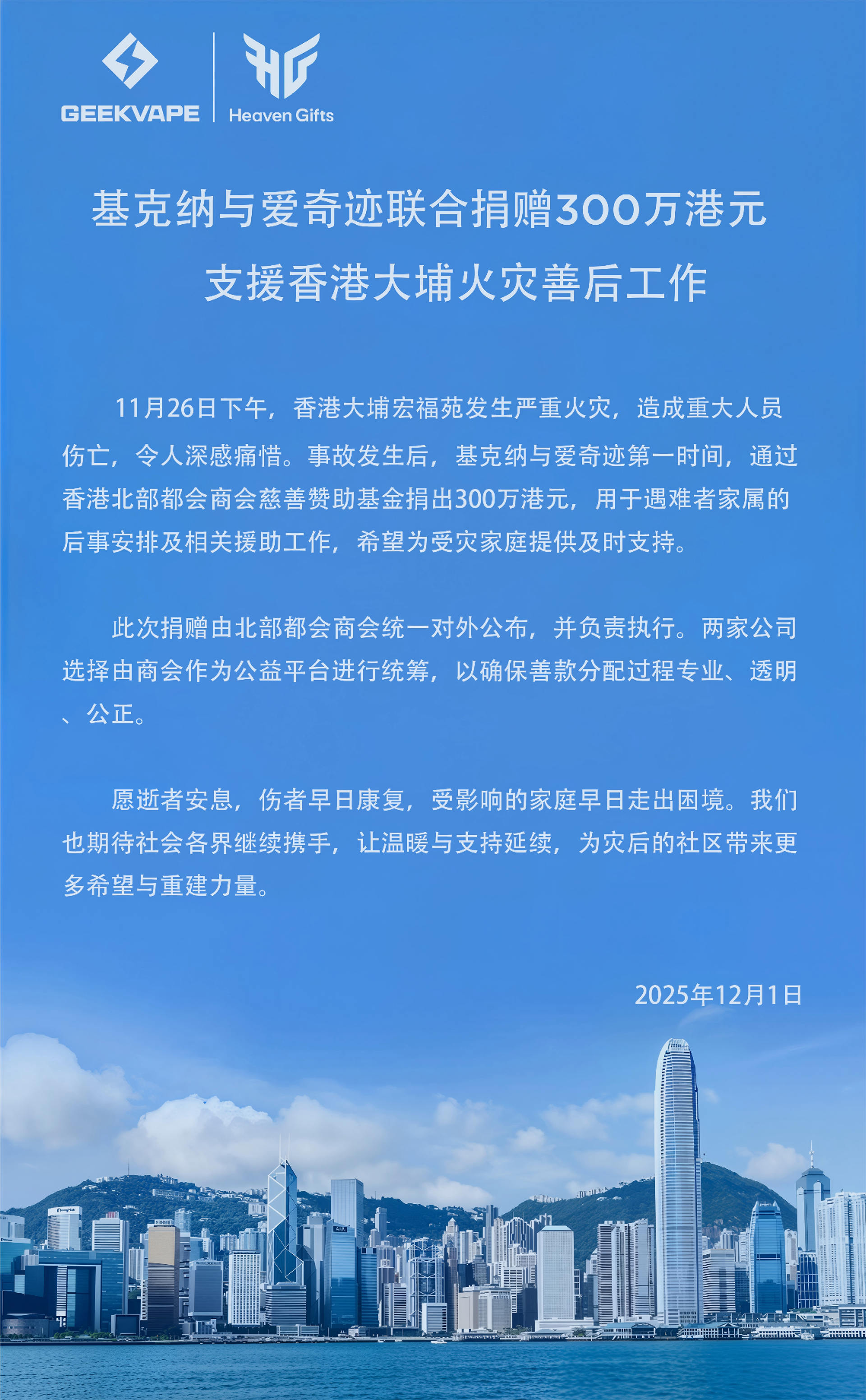 基克纳与爱奇迹联合捐款300万港元 支援香港大埔火灾善后工作